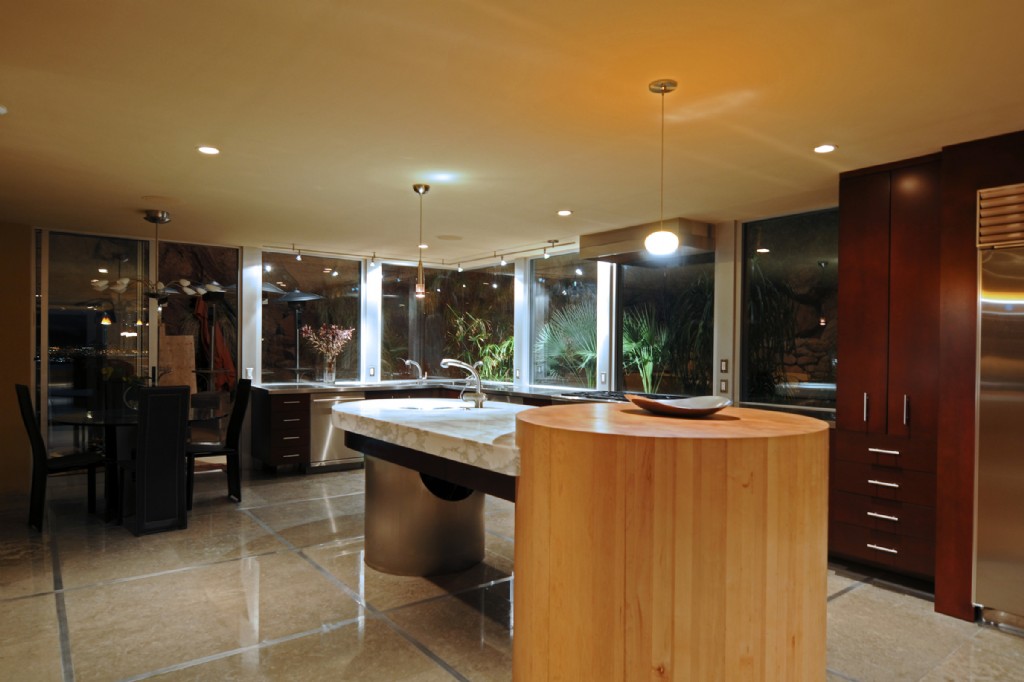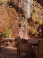 A cascading waterfall against the native red rocks provides a backdrop to the spacious outdoor kitchen and barbeque area, and at the main entrance, a veil of water spills down next to the massive front door. Perhaps most spectacular of all is the phenomenal negative edged pool, which soars out into the skies. The triangular shaped one hundred percent infinity edged pool spills over in all directions, and at the far point lies a submerged Jacuzzi.