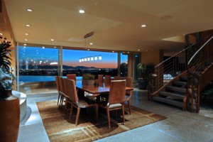 The formal dining room is a modern yet regal setting with stunning views and open spaces.
