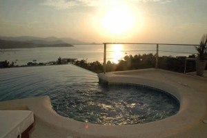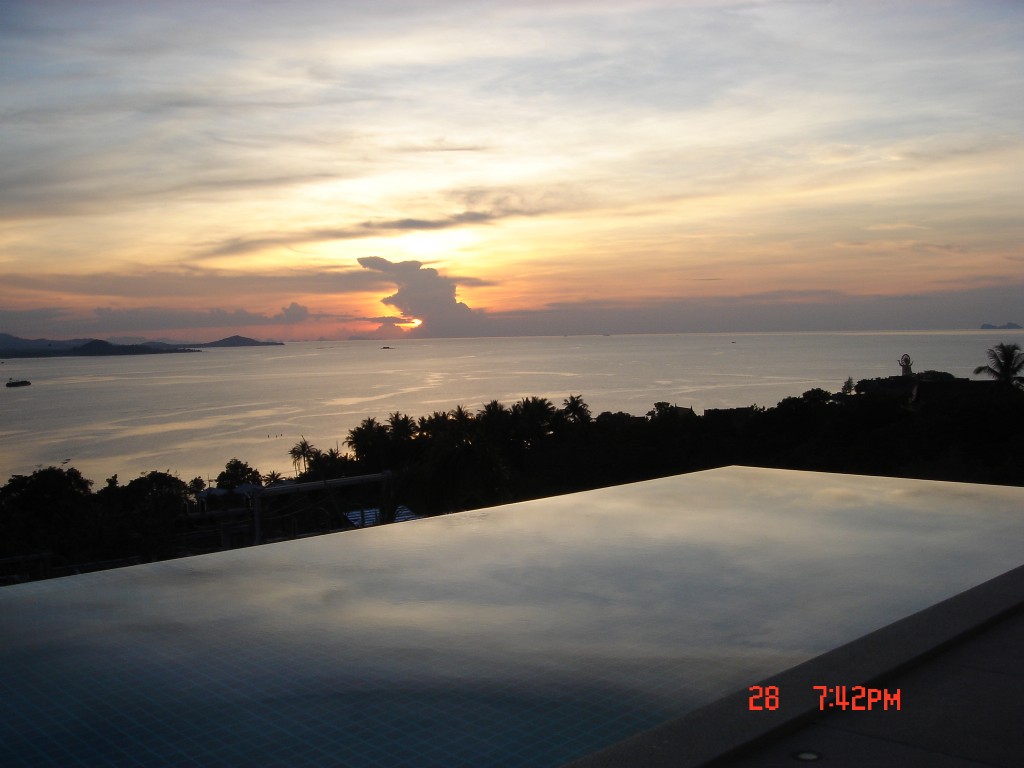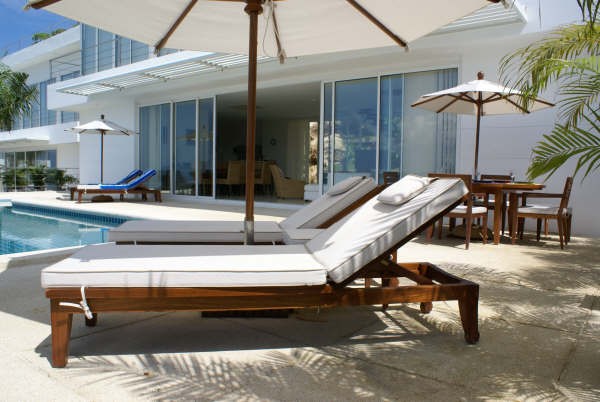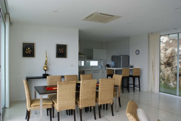 The living dining room opens on to the spacious sand-wash pool deck where endless time will be spent. There are a row of palms in pots along the far side to give more privacy. Quality teak cushioned sun loungers, umbrellas and patio table (seat 8 persons) and chairs, ottomans which are available for your relaxation. Spectacular views over Big Buddha Bay and not forgetting the amazing sunsets form the perfect backdrop for the 10m x 5m infinity edge pool and corner Jacuzzi