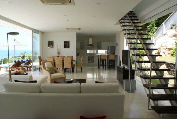 An open staircase to the rear of the living room leads up to the second floor, with the adjacent glass wall extending across the two floors. A gallery corridor interconnects the three air conditioned bedrooms. An external stairway leads to the spectacular 90sqm roof terrace, which include a seating area, dining area, bar and BBQ with stunning view of Big Buddha bay to the northwest and Chaweng bay to the southeast.