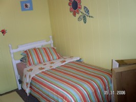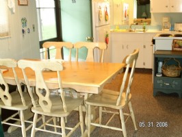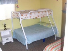 Queen bed in the master bedroom, double/twin bunk and twin bed in the 2nd bedroom. Kitchen has refrigerator, stove, & microwave. For inside fun there are games to play & of course TV with cable, DVD player and VCR.