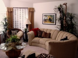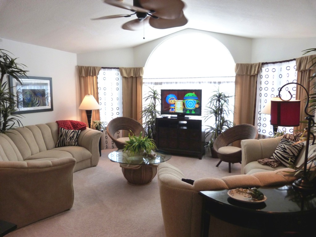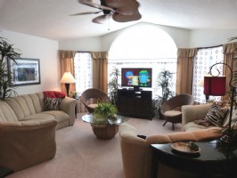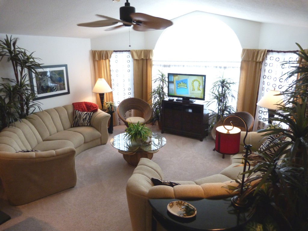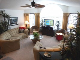 •Huge L/R with a 48" flat screen TV and DVD, circular couches and chairs under a high cathedral ceiling, large TV, tropical plants, spectacular window treatments