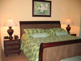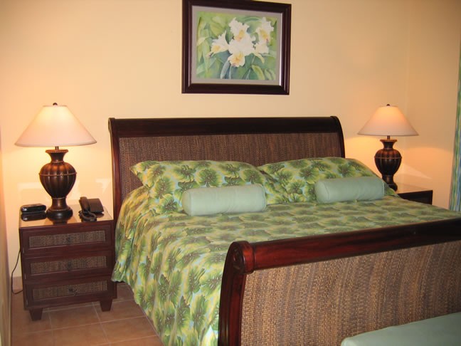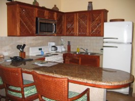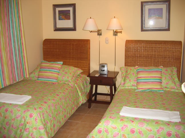 The upscale two bedroom two bath condos are tastefully decorated. There is a master bedroom with king size bed and adjoining bathroom, a guest room with either two twin size or king size beds, a guest bathroom, living area with double sofa bed, and dining patio. A fully equipped kitchen and laundry room with washer and dryer are also part of the layout.