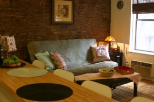 Living room has futon that opens to a full size bed (slips 2), 46 flat screen TV and air condition.