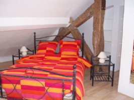 master bedroom under the roof with beans and double bed, closet, Tv, bathroom with shower, toilets, sink