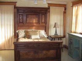 The bedrooms are as follows: One private queen bedroom and bath suite on the first floor. Upstairs you'll find the spacious master bedroom (and private bath) which contains a gorgeous 160-year-old hand carved bed, with an adjacent enclosed room containing an additional twin bed which can be used as a private sixth bedroom. This "bonus" room gets great sunlight. Also upstairs are three more spacious bedrooms. Altogether, you have 5 bedrooms and an extra twin in the "bonus" room off the master bedroom upstairs. Two full baths, one with claw foot tub and separate marble and travertine shower and a third vintage inspired bath with shower only. Rooms are spacious, and beds are comfortable. Ample room for dining, with separate common rooms for relaxing and socializing.