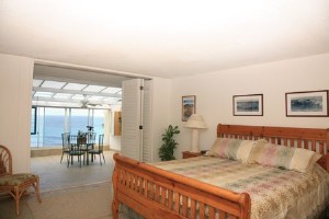 The entry doors to this 2,000 sq.ft. condo were carved by James Hargraves, a nationally known Kauai glass artist. They lead into a sun room/atrium and a large living room. There is a 400 sq.ft. lanai with table, lounges and BBQ, which adjoins the living room. The master bedroom (with king bed) is open to the ocean view, but it can be separated from the atrium by moving a bank of plantation shutters. The large second bedroom has a queen bed and its own separate bath. The washer and dryer are in this bathroom. The fully equipped kitchen with maple cabinets and granite countertops, sits behind the living room and large dining room. In July you can be seated at the dining room table or preparing a late dinner in the kitchen and watch the sun set directly in front of you.