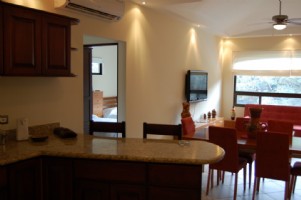 2 Bedroom,2 Bath new condo,fully furnished.Marble bath areas,whirlpool tub in master bedroom bath,granite countertops and tile floors,with 2 lcd tv`s and cable,phone and internet available. A/C in all rooms,3rd floor ,with balconys off of each bedroom.Huge lap pool below!