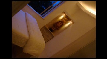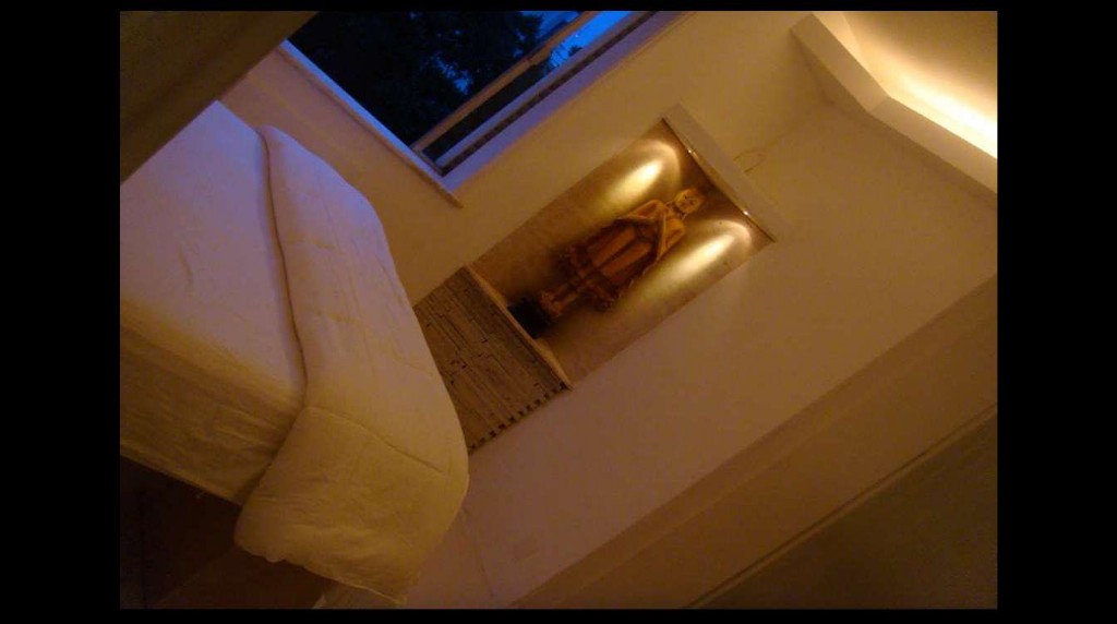 one bedroom has a queen size bed and the same asian decoration and theme found throughout the apartment. this bedroom also has a private bathroom and a 7-ft glass wall separating the shower from the bedroom itself - room with a view!
