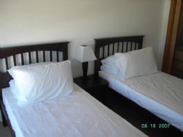 The good sized bedroom offers twin single beds, mirror, heater and a huge double wardrobe with hangers and drawers , there is also another double wardrobe in the small hallway .
