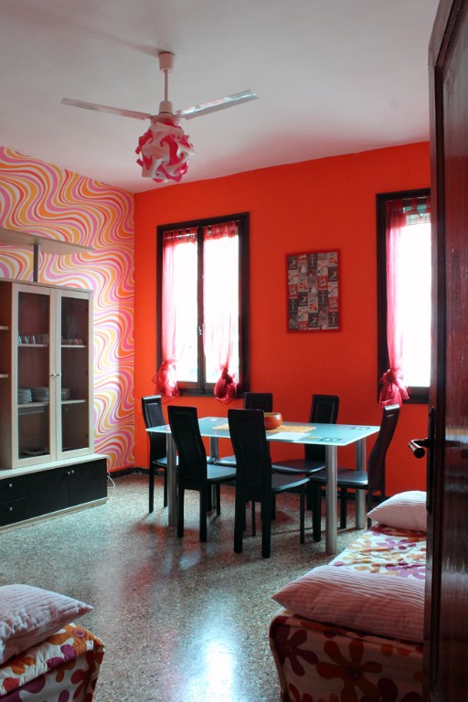 We have still finished the refurbishment of this large flat at the second floor, overlooking a beautiful square in Cannaregio. My mother and I have been talking a lot about '70: she lived those years, and I've been involved in listening to her passionate tales about her youth. That age is now coming back, inspiring fashion, music, art and people. Who doesn't like the colours, the shapes and the optical style that in '70 was more than a mood? If you have been waiting for something new in Venice, take a look to this beautiful, new apartment! ...In the meantime, be aware that there is nothing similar in Venice: enjoy it!