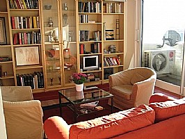 Living room with couch, chairs & floor to ceiling book shelves looking out on the terrace and the Paris skyline.