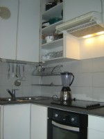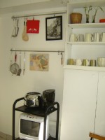 Fitted kitchen with microwave, ceramic glass cooktop, traditional built in oven, coffee machine, toaster, fridge and freezer, electric kettle, washing machine and a lot of plates, mugs, cutlery, pans...