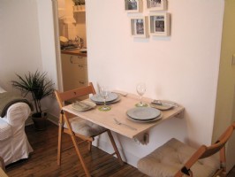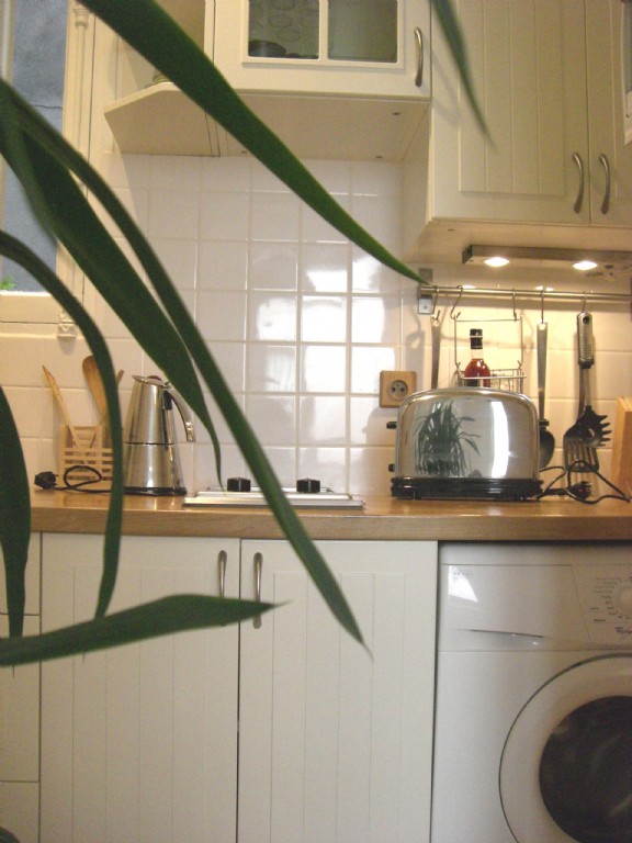Off the living room is a kitchen outfitted to good standards with white furniture and wooden surface. Whether you share our passion for cooking or you just want to reheat some of the delectable delights you have picked up from the numerous food shops or at our local street market, you will find all that you need.