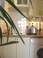 Kitchen is brand new, nice retro design, wooden surface and white furtniture and very clean, fully equipped with mini oven/grill, w/m, fridge and plenty of kitchen utensils and lots of storage.